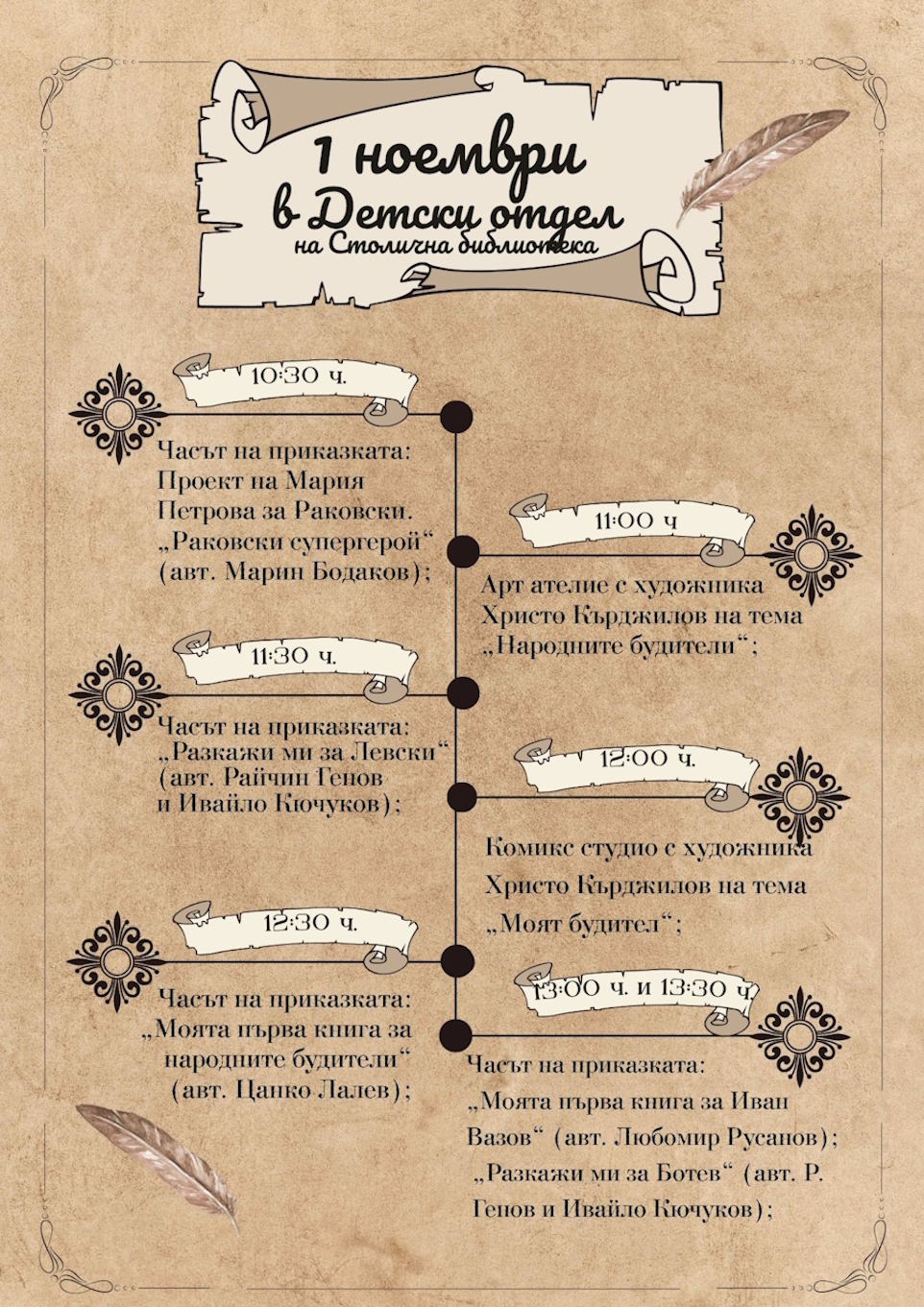 Ø В Детския център програмата на 1 ноември е от 10:30 до 14:00 часа и включва популярната инициатива „Часът на приказката“ с представяне на любимите книги: „Разкажи ми за Левски“ на Райчин Генов и Ивайло Кючуков, „Моята първа книга за народните будители“ на Цанко Лалев, „Раковски супергерой“ на Марин Бодаков, „Моята първа книга за Иван Вазов“ на Любомир Русанов, „Разкажи ми за Ботев“ на Райчин Генов и Ивайло Кючуков. Заниманията с художника Христо Кърджилов в артателието и комикс студиото са на тема: „Народните будители“ и „Моят будител“. Ще бъде открита и тематична изложба с рисунки, посветени на празника, на деца от 1. до 4. клас.