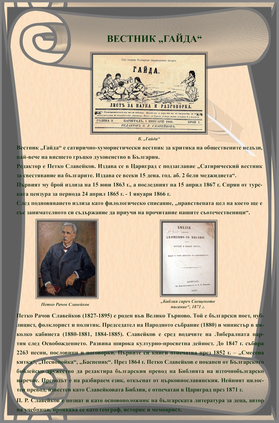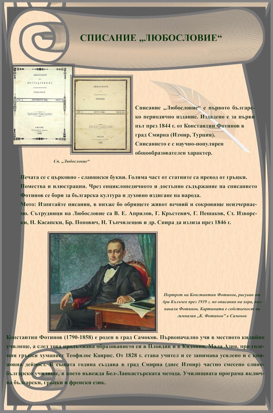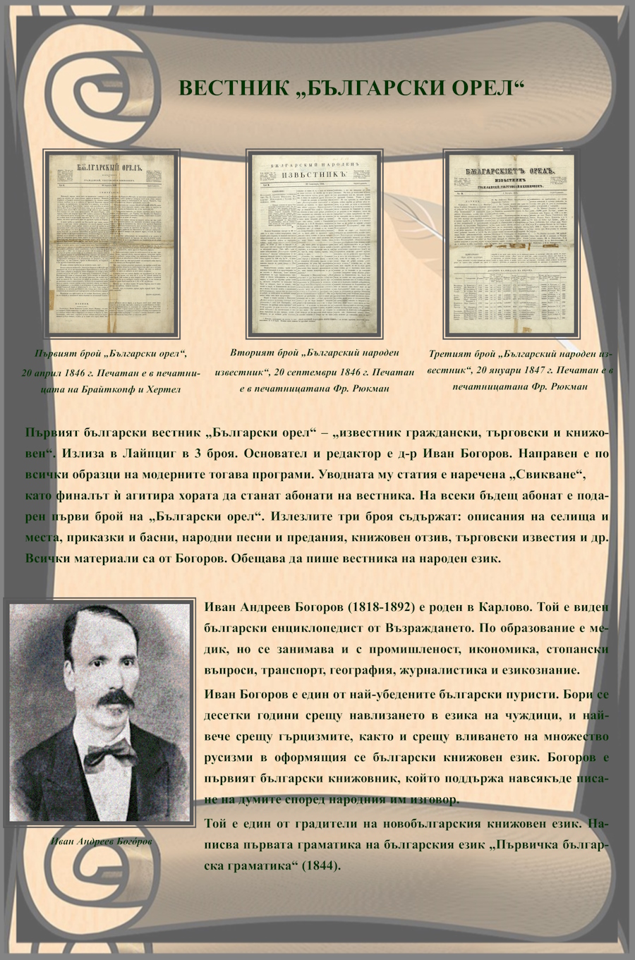 Посетителите ще имат възможност да научат повече за първото българско списание „Любословие“ (1844) на Константин Фотинов, за първия български вестник „Български орел“ (1846) на Иван Богоров, който две години по-късно през 1848 г. издава „Цариградски вестник“, където за първи път е употребена думата „вестник“. Интерес представлява и първият хумористичен вестник „Гайда“ (1863) на Петко Славейков, издаваните от Г. С. Раковски вестници „Българска дневница“ (1857) и „Дунавский лебед“ (1860), както и списанието, което допринася за културното издигане на народа ни и за формирането на българската интелигенция „Български книжици“.