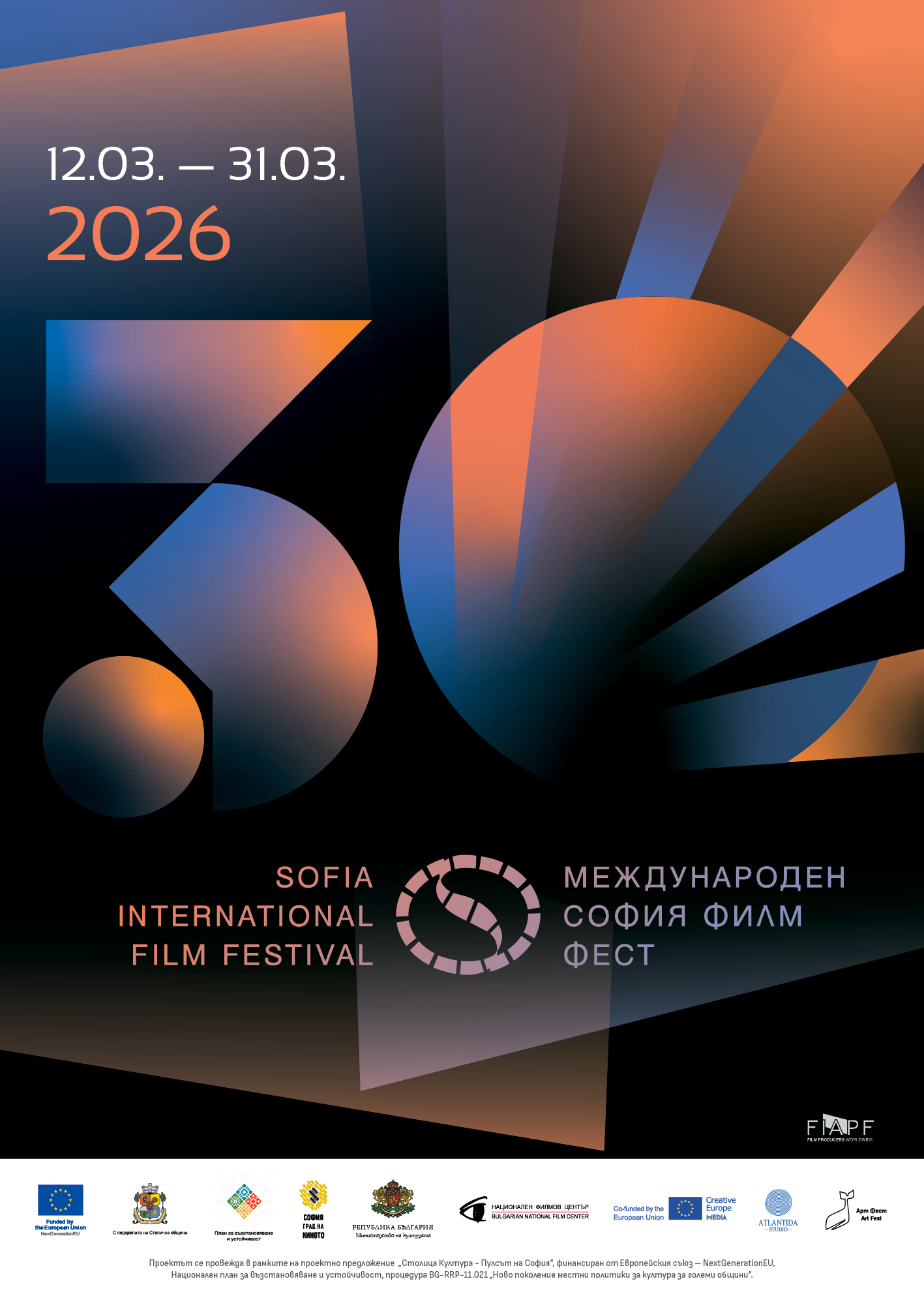 30-ият Международен филмов фестивал "София Филм Фест" очаква своите зрители от 12 до 31 март. Фестивалът се организира от "АртФест" в партньорство с "Атлантида студио" под патронажа на Столичната община в рамките на проект "Столица Култура – Пулсът на София", финансиран от Европейския съюз – NextGenerationEU, Национален план за възстановяване и устойчивост, процедура BG-RRP-11.021 "Ново поколение местни политики за култура за големи общини". Реализира се с подкрепата на Министерство на културата, ИА „Национален филмов център“ и Програма „Творческа Европа“ МЕДИА на Европейския съюз, съвместно с културни институти, спонсори, партньори и приятели.