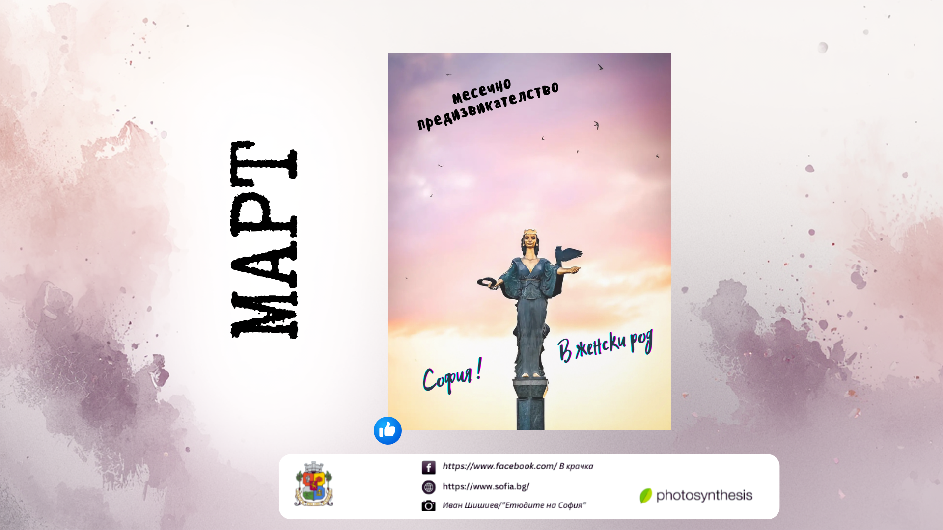 През март обръщаме поглед към детайлите, грацията и силата. Градът не е само асфалт и сгради – той е емоция, уют и характер. Търсим вашия кадър, който улавя женското начало на столицата – било то през лицата на нейните момичета, пролетния полъх по улиците или меката светлина над Витоша.