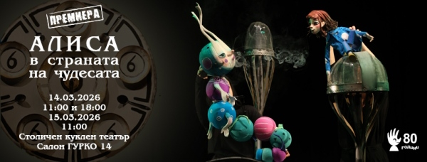 На 14 март от 18:00 ч. в Столичен куклен театър ще се състои премиерата на кукления спектакъл "Алиса в страната на чудесата" по Луис Карол. Заглавието е първата премиера в годината на 80-годишния юбилей на Столичен куклен театър.