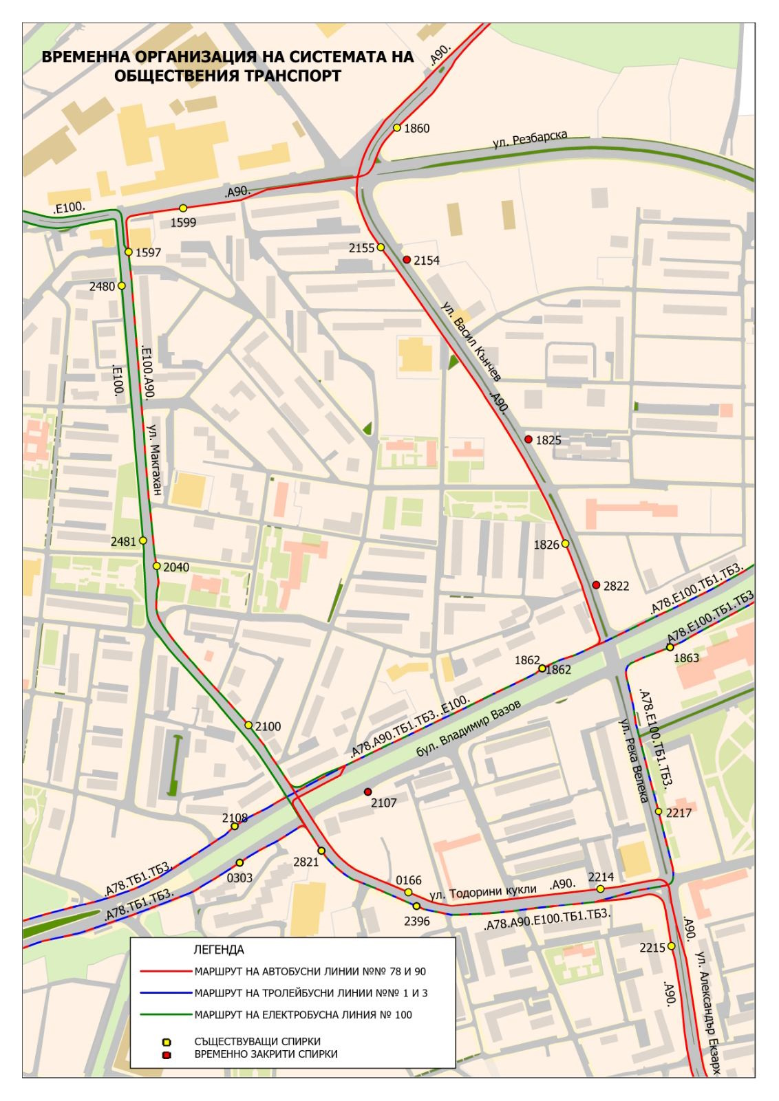 Тролейбусите от линии № 1 и № 3, както и автобуси по линии № 78 и № 100 са отклонени по ул. „Тодорини кукли“ и по ул. „Левски Вековен“, а автобус № 90 в посока „Малашевци“ продължава по ул. „Острово, ул. „Макгахан“, ул. „Резбарска“. В посока „център“ маршрутите на градския транспорт не се променят.