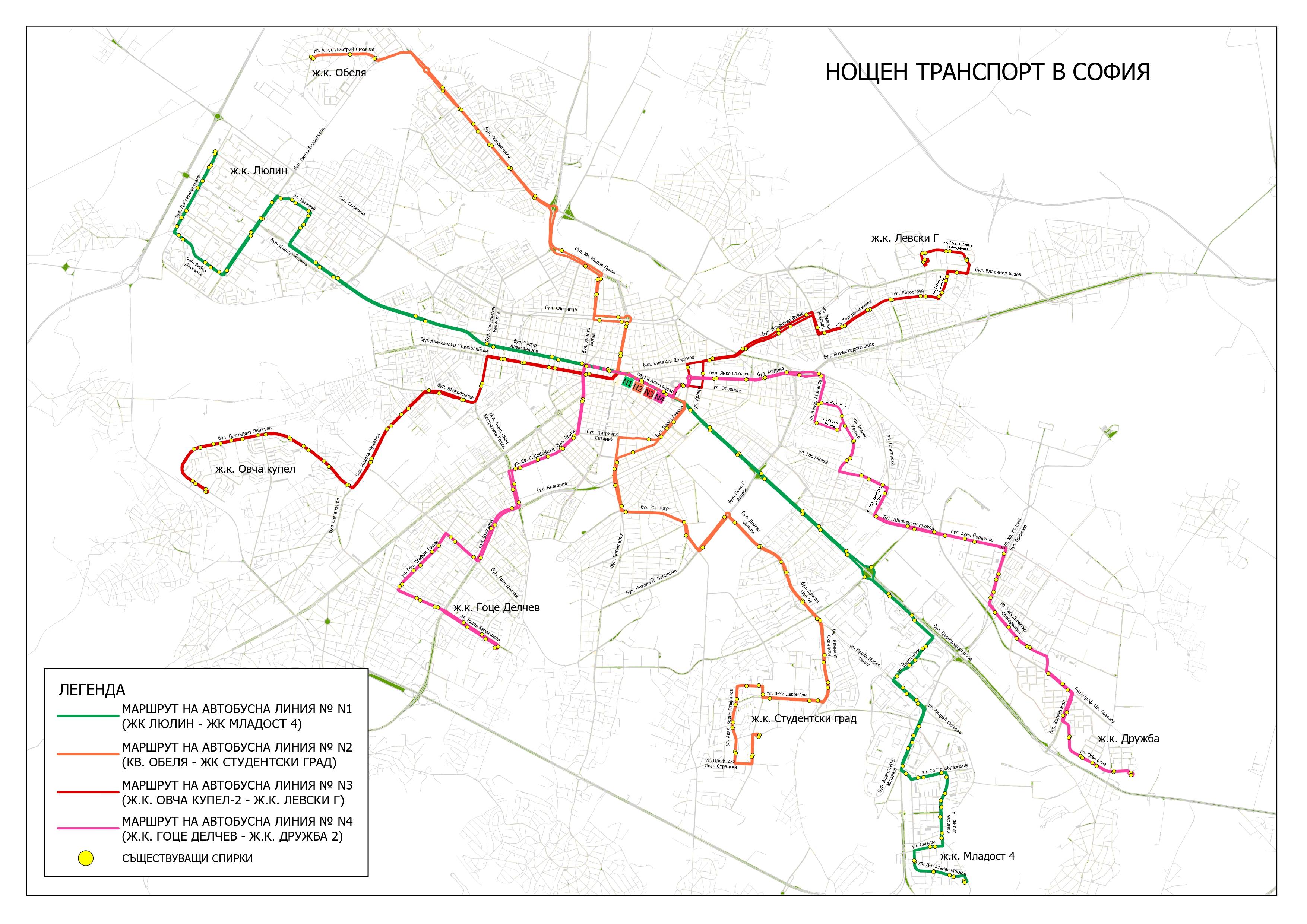 СХЕМА – Нощен транспорт в София – N1 ,N2, N3, N4